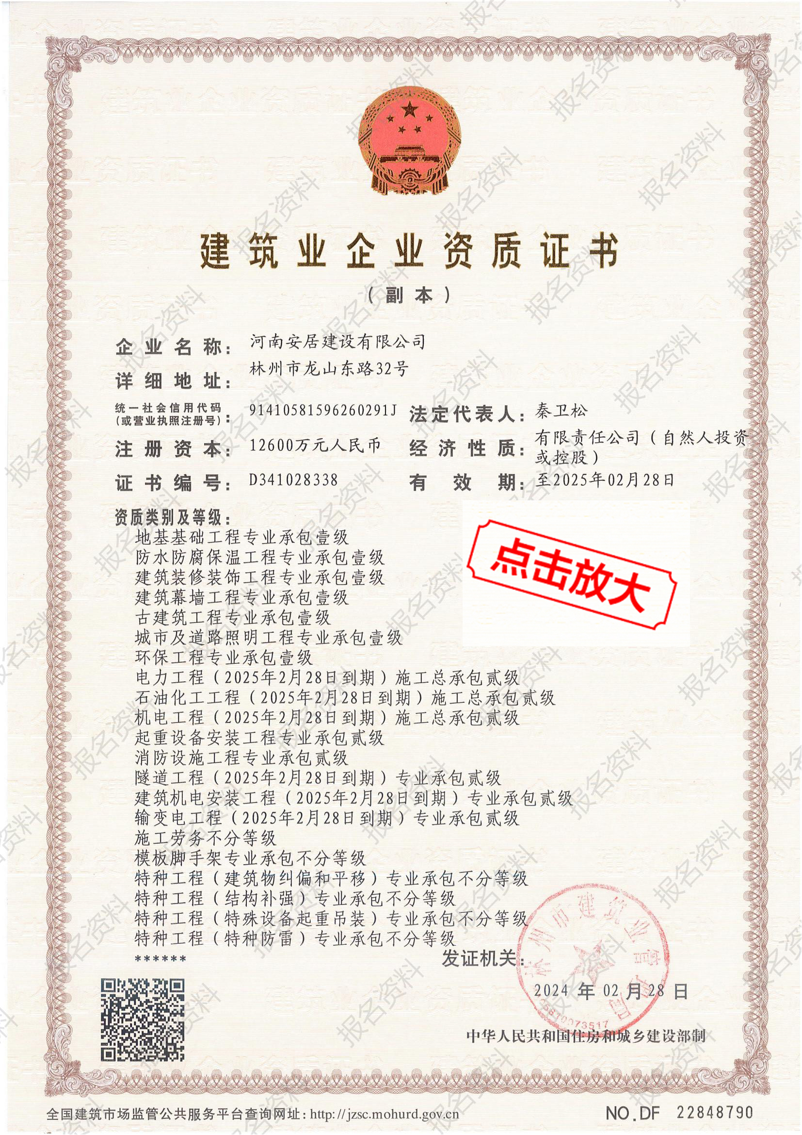 滔滔黃河哺育了中華民族拼搏向上的奮斗精神,巍巍太行造就了中原兒女的紅旗渠精神。百萬林州人下太行,鑄就了中國建筑之鄉(xiāng)響當(dāng)當(dāng)?shù)囊燮放啤:幽习簿咏ㄔO(shè)有限公司從誕生起血液里就流淌著紅色基因,秉承“安得廣夏千萬間,大庇天下寒士俱歡顏”的擔(dān)當(dāng)精神,用鋼筋混凝土筑起了高樓大廈,也用一流品質(zhì)、家國情懷打造了安居建設(shè)的輝煌成績。公司成立于2012年,注冊(cè)資金12600萬元,公司成立至今,擁有建筑,市政施工總承包等十項(xiàng)一級(jí)資質(zhì);其他二級(jí)等資質(zhì)共二十余項(xiàng)。公司秉承質(zhì)量第一,服務(wù)為主,堅(jiān)持垂直管理,從不設(shè)立分公司等分支機(jī)構(gòu)。